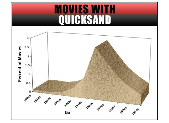 So, it’s still awesome, just not in the old fashioned wrong ways.  In the 1960s, quicksand was shown in 3% of movies. Unfortunately, poaching and loss of habitat has pushed this brilliant adventure gimmick to the brink of extinction (0.5%).  Donations welcome.