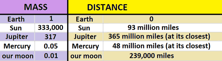 So, what’s massive and what’s close? To keep the numbers simple, lets look at mass and distance in comparison to Earth.